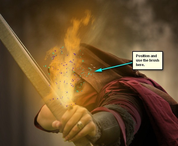 Now we will be adjusting the light and shadows created by the fire arrow. To start, create a new layer (Ctrl/Cmd + Shift + N) above the “fire” group; name this layer “glow”. Activate the Brush tool (B) and reset the brushes. Next, input the following: