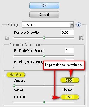 Once it has been created, go to Filter > Distort > Lens Correction. Find the tab Vignette and use these settings: